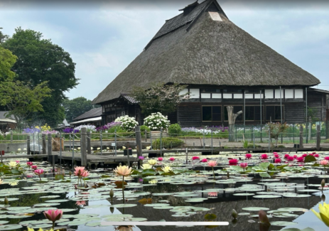 鯉艸郷のシンボルでもある茅葺民家「鯉艸亭」は平成2年移築復元しました。十和田市切田地区の加賀沢家の昭和初期の民家でした。茅葺の屋根は津軽の茅葺職人が約1ヶ月かかって葺いたものです。今では茅葺職人も少なく、茅そのものもすくなくなっています。中の柱や梁は主にケヤキで間口11間、奥行6間の66坪です。鯉艸亭では、石臼で挽いた「手打ちそば」「わっぱとりめし定食」などの食事ができます。また、昔懐かしい囲炉裏を囲んでのご宴会、会食などにもご利用いただけます。